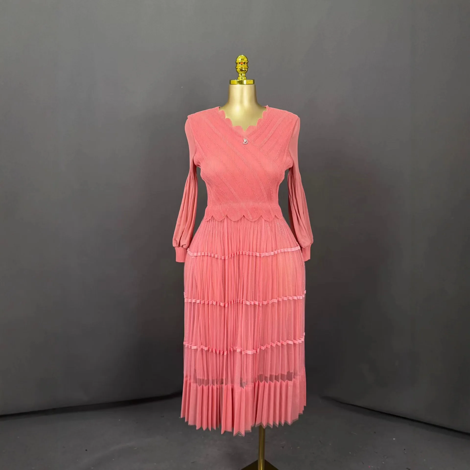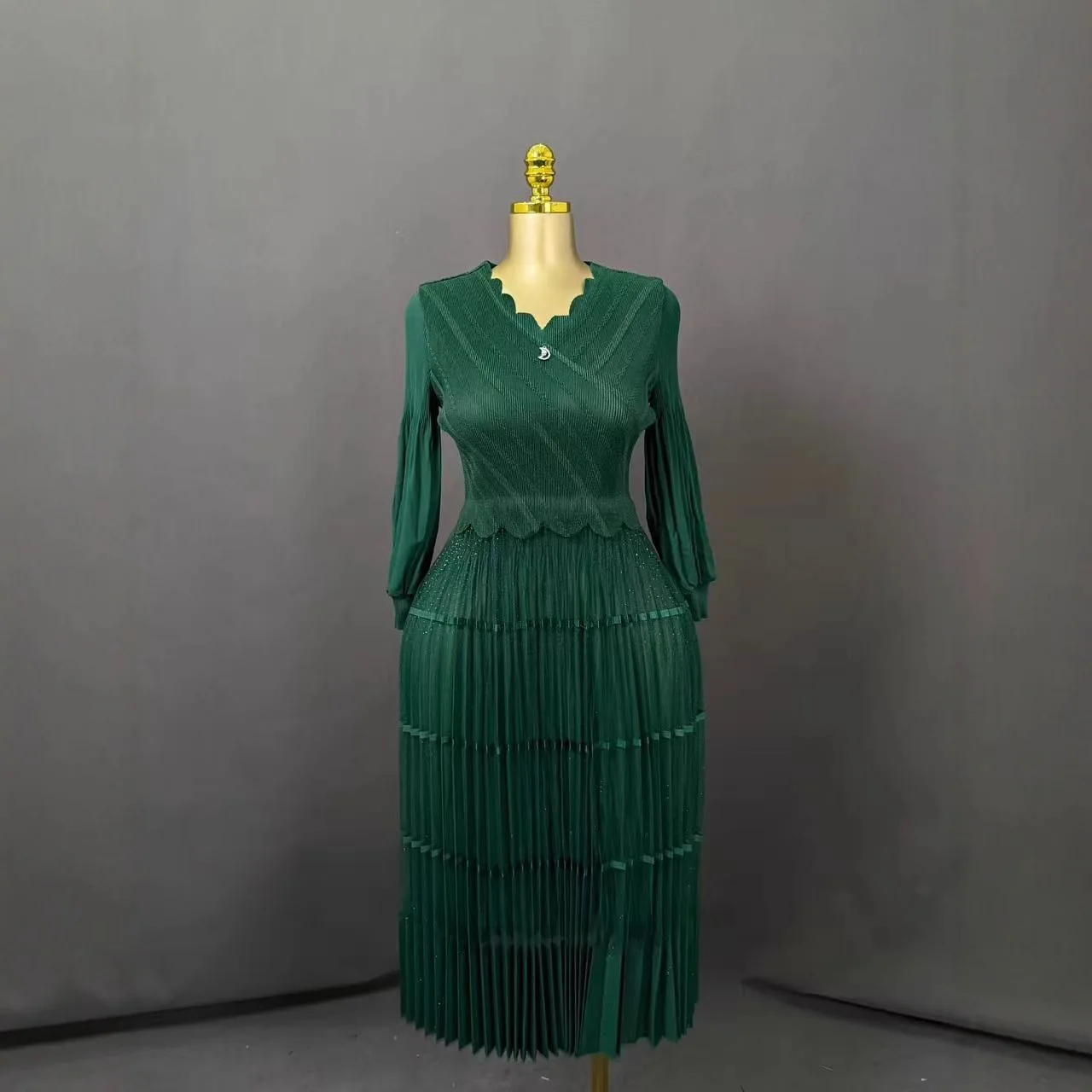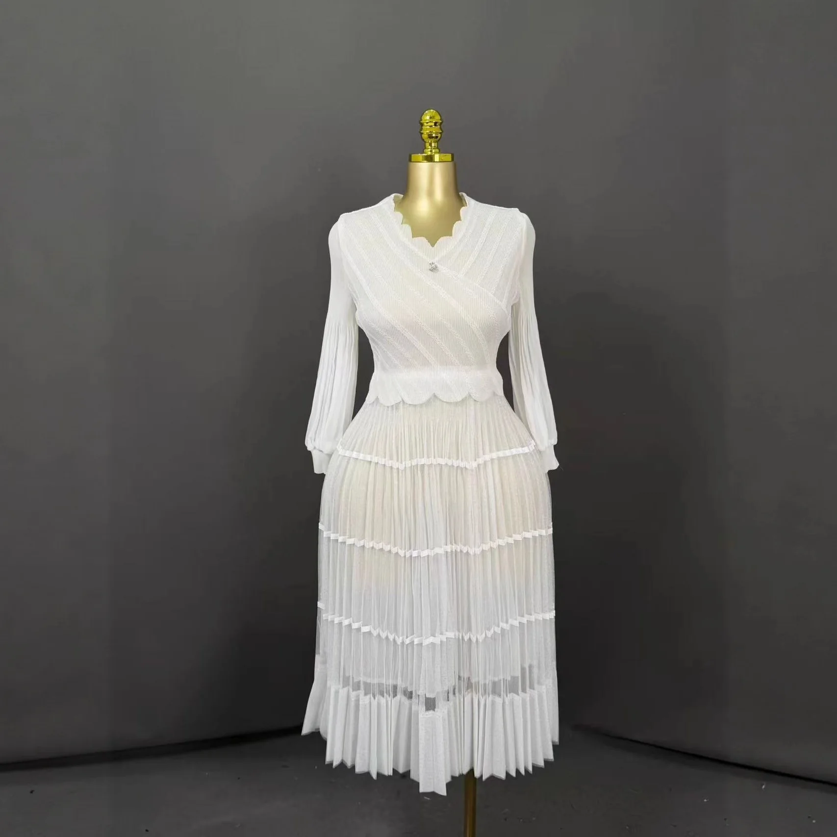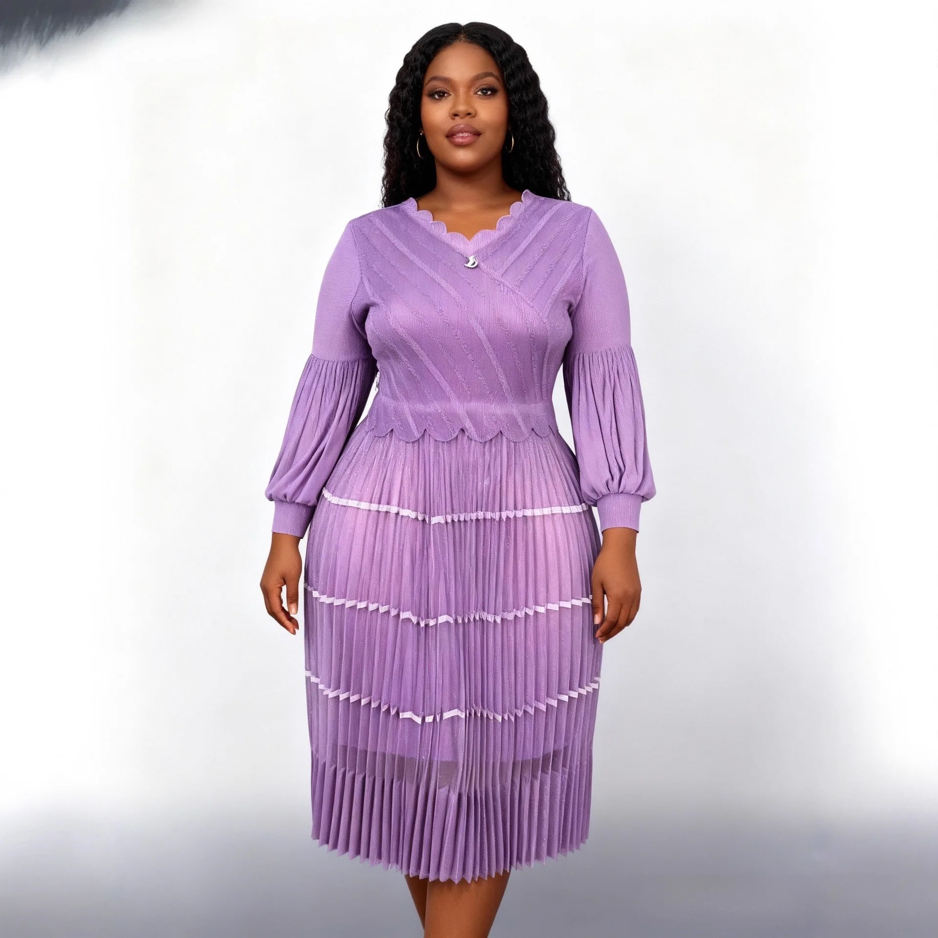 Plus Size Pleated Midi Dress for Women - Elegant Ruffled V-Neck Puff Sleeve Dress with Striped Trim